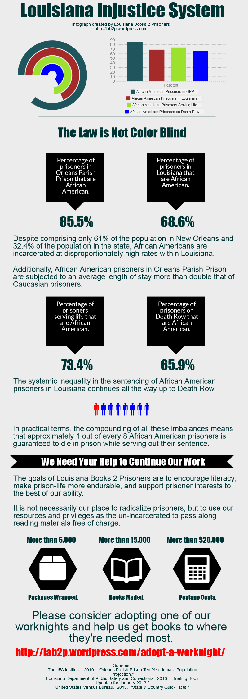 The members and volunteers of Louisiana Books 2 Prisoners believe in encouraging literacy and improving access to education for prisoners.  To help illustrate why, we’ve created a few infographics about the scope and size of the problem America’s prisons have created.